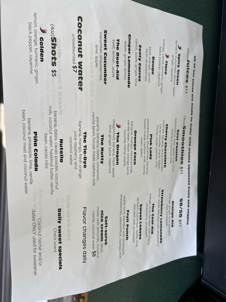 The menu is a delightful blend of freshness and flavor. Start with a refreshing juice like the Spicy Green or the zesty Rueht’s BeetAid, both priced at $11. For those craving smoothies, the Cherry Chocolate or Orange Coco stand out for their rich taste and invigorating ingredients, each also available for $11.